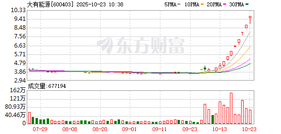 大有能源再度涨停,10个交易日内录得9个涨停,累计涨幅为146.68%,累计换手率为34.68%。截至9:48,该股今日成交量6685.98万股,成交金额6.32亿元,换手率2.80%。最新A股总市值达231.19亿元。